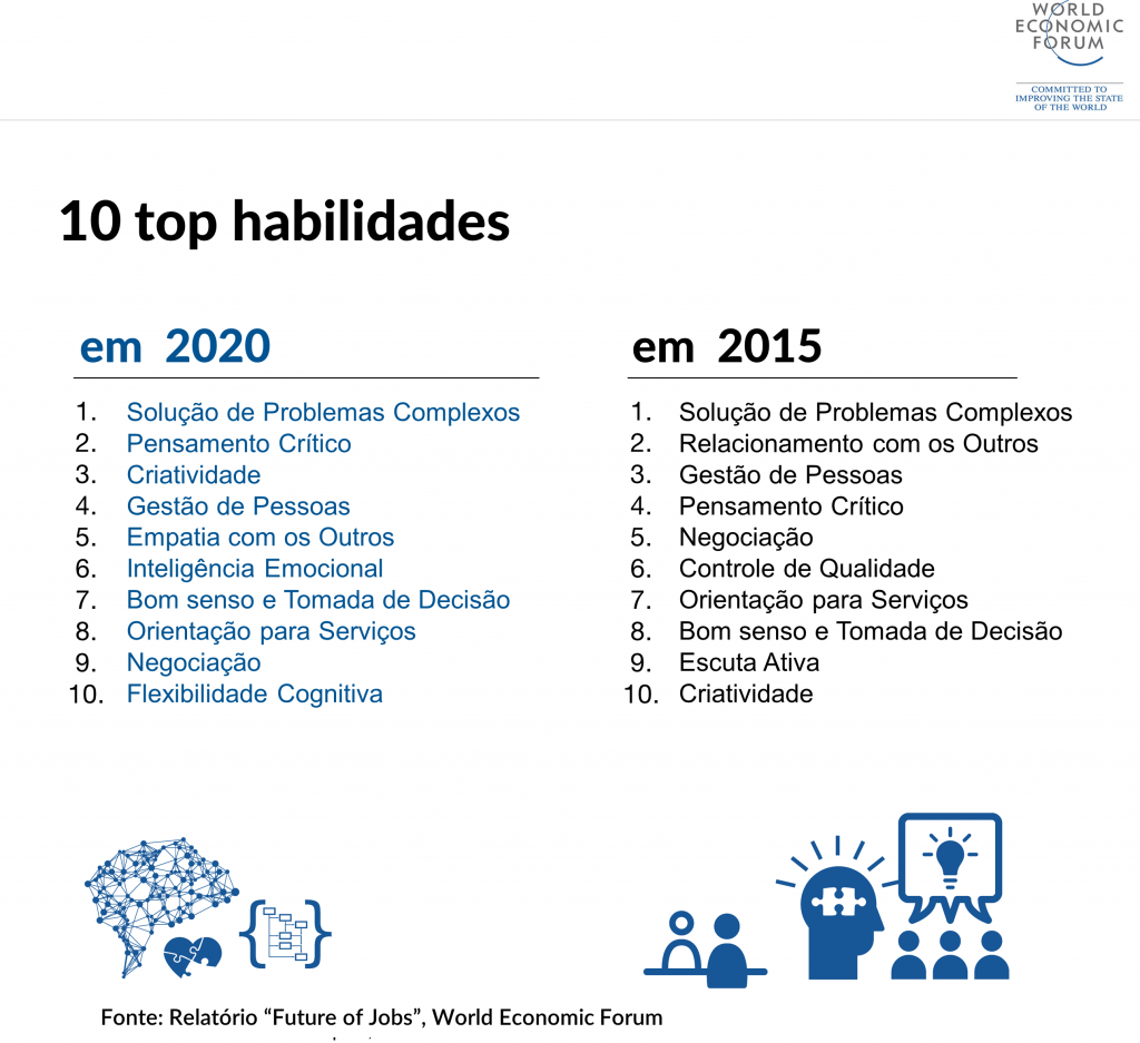 O Fórum Econômico Mundial, em seu relatório sobre o futuro do trabalho (The Future of Jobs Report), ao comparar as habilidades mais importantes em 2015 e as projetadas para 2020, listou 10 soft skills. Os conhecimentos em programação, algoritmo, tecnologias ou quaisquer outros hard skills foram entendidos como essenciais, mas secundários. As tecnologias atuais avançarão e serão substituídas por outras ainda nem pensadas. A Flexibilidade Cognitiva (décima habilidade) é essencial por isso. Estamos em uma ambiente volátil, líquido ou, se você preferir, um Mundo V.U.C.A.: Volatility, Uncertainty, Complexity e Ambiguity (em português: volatilidade, incerteza, complexidade e ambiguidade). É um ambiente de transformação contínua. Ao olharmos com mais atenção as 10 habilidades, poderemos perceber que são destinadas a todo e qualquer profissional, mas com forte impacto sobre líderes e à capacidade de lidar com pessoas. A comunicação é um elemento transversal e indispensável a quase todas as habilidades. Em verdade, a todas, mas para algumas é um elemento residual. A construção e a gestão de boas relações, que sejam criativas, saudáveis e promovam o Alto Desempenho Harmônico, equilíbrio entre trabalho e vida privada, é ponto crucial. Para isso, a Empatia é um tópico que vale destacar, como mola propulsora de uma gestão com base em uma cultura inovadora e humanizada que propicie um ambiente colaborativo.